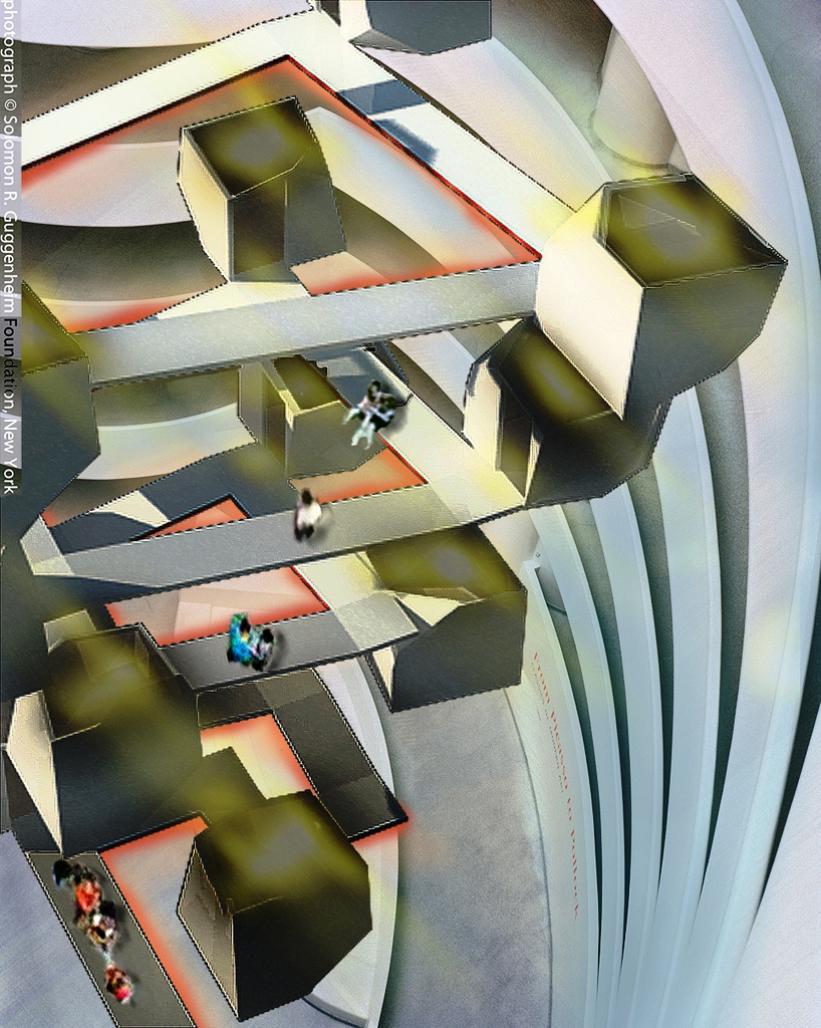 In each ramp sections there are white polygonal boxes with different environments: jungle, desert, city, open field, as well as sound, light, color, taste, smell… The path begins at the rotunda floor with a white initial box completely empty, going through countless boxes along sensory climb up and finish in lightdome.