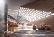 Raised degustation hall along the terrain, occupies the height between two parts of building, it is the most lively space, a porous slanted lighting roof covering it, pouring filtered lights into the interior.
