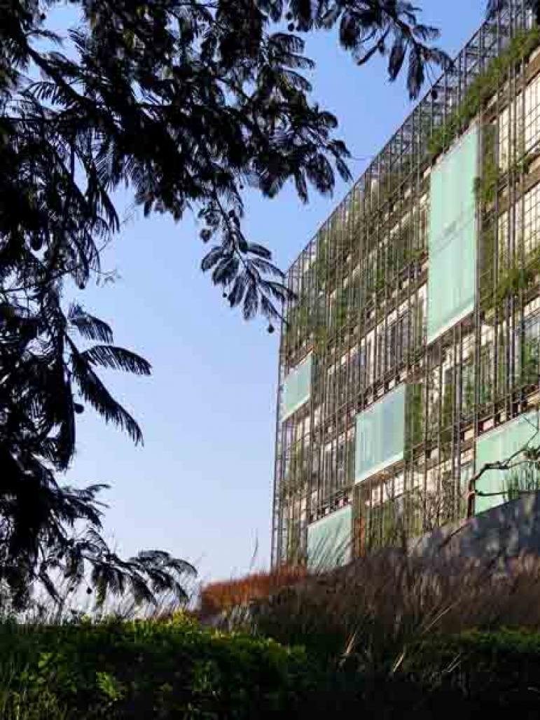 Located in Cyber city, Hyderabad, these two corporate buildings employ the idea of a double skin as an energy saving and modulating mechanism. The inner skin of the building is an reinforced concrete frame with spec aluminum windows. The outer facade comprises of a cast aluminum trellis with Hydroponics trays integrated for growing a variety of plant spices. The trellis also has a misting system integrated in order to control and regulate the amount of water released to the plants and trays. The principle of using a moist screen, as way to cool the interiors of a building is a time tested traditional method. However, here the screen takes on an aesthetic function of a dynamic facade where different species are organized in a way to create patterns as well as bloom at different times of the year bringing attention to different parts of the building facade at different times.