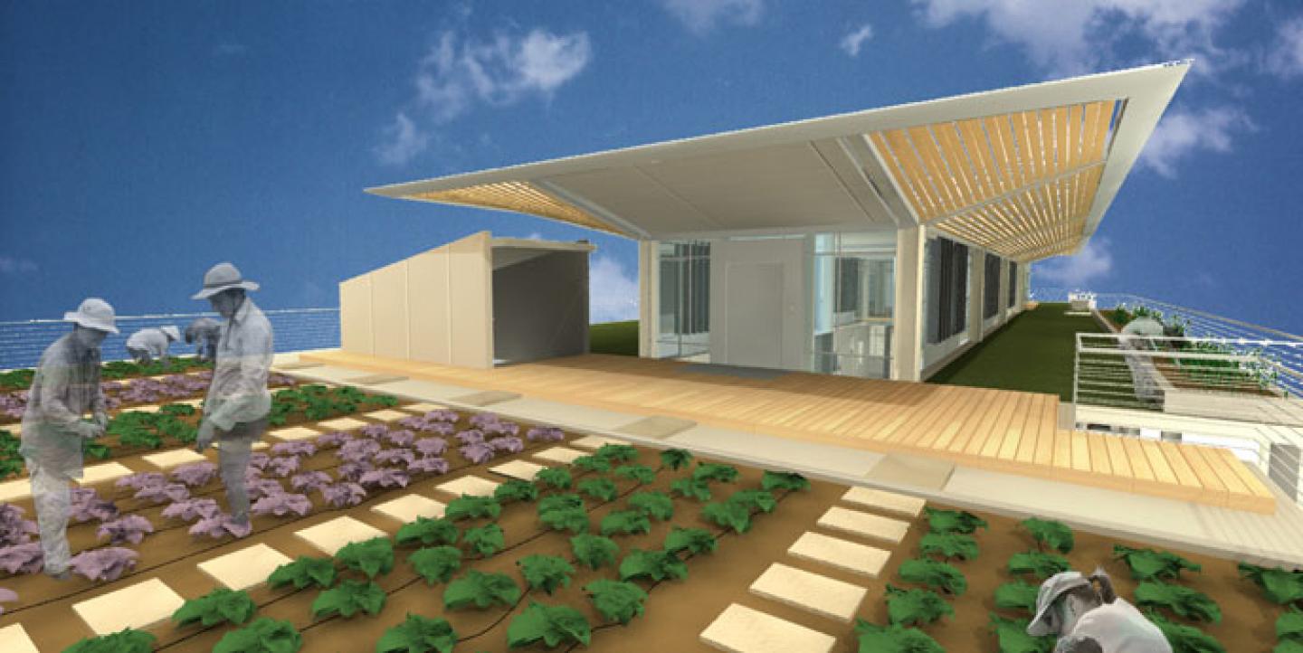 Agro-Housing is a program that combines a high-rise apartment complex with a vertical greenhouse within the same building.