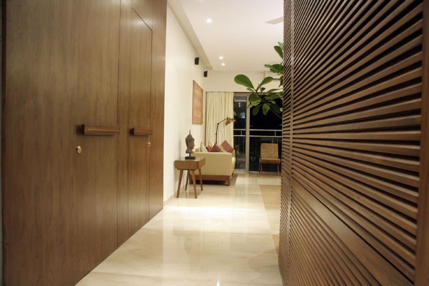 When the clients approached us for this project they were clear what they wanted. As the concepts and design briefs were presented we were more concrete on how the overall ambience would be. In Mumbai people pay the cost of moon for a decent living hence every area of the house had to be utilised yet leaving it clutter free. We had a detail tour with the client to see some of his existing old furniture which was quite unique in a way. We had no second thoughts to reuse a few pieces. The pieces once brought on site were selected, carefully dismantled and cut as per the new sizes and proportions. As one enters the house he is welcomed by a lengthy passage of louvers creating a sense of curiosity. The living area has quite a wide spread with a compact dining closer to the kitchen. Creating space is always a challenge in city homes as we have to begin with compromised environment. An area was then created for den room to entertain close friends and guests. Care was taken to maintain a certain material palette throughout the house to give it a warm touch. The master bedroom makes a mark with a blend of modern and primeval, most of the old furniture was brought to use here resulting solid wooden wardrobes. Bedroom 01 has a cosy feel with a customised suspended lamp which adds to the ambience.