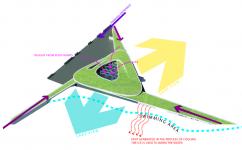 The structure based on the triangular plane is formed with three freely climbing, grass overgrown ramps that rise smoothly from the ground. Ramps entwine with each other and become self – supporting structure. The dome effect is used – when all elements are merged together they are balanced. Thanks to the ramps the overall recreation area is equilibrated - they became the full part of the park. What’s more an alternative outdoor grandstand is created while the central part is opened, glass covered, to let the sunlight penetrate the interior and to let the audience gathered outdoors observe the ice skaters, competitions, matches and so on.