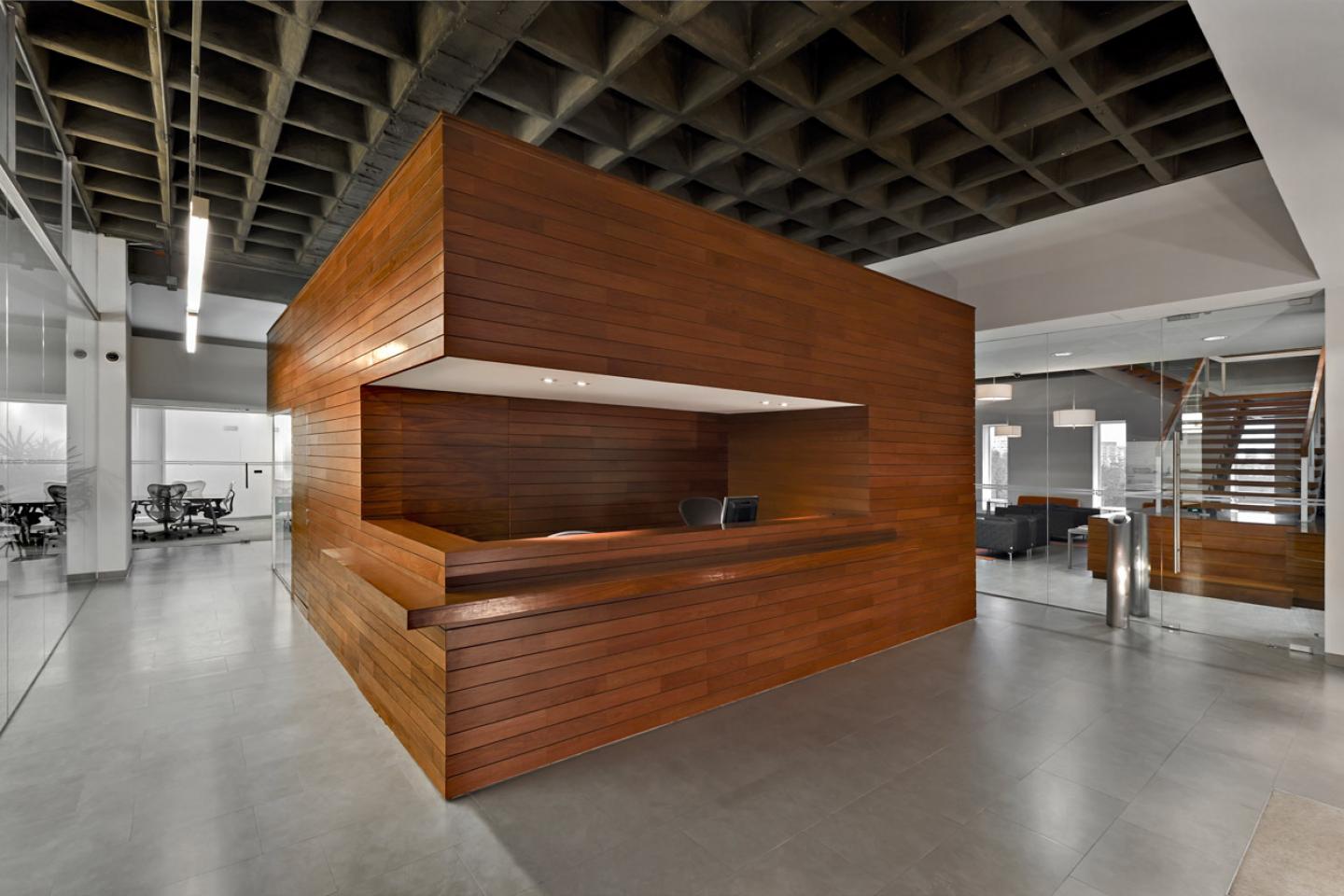 A big wood box, inserted respecting the surrounding design, greets everyday collaborators and visitors. Inside the box were located the reception, support area and interview halls, on top of it –with a panoramic view of the finance area- the personalized area to serve the dealers.