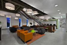 The client decided to implement in their office a lounge style cafeteria –like a hotel lobby- because before the relocation the majority of the collaborators preferred to work and meet in the close by cafeterias to enjoy a more relaxed ambiance. This space has all the necessary services and it is a nice surprise for the visitors because there are screen, complimentary computers with Internet, snacks and drinks.