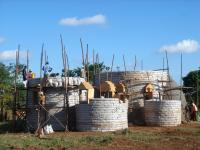 Each cluster is composed of four living units, each one with a living room, two bedrooms, a kitchen, toilet, shower room, and meditation room. All the buildings are built with Earth-bag Construction Technology (Eco-Tec 01).