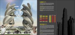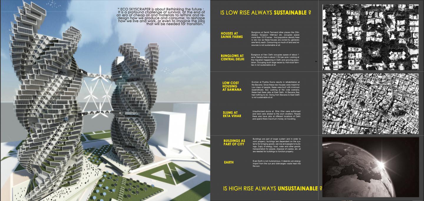 This Eco-Skyscraper is an example of robust Architecture for not just sustaining but surviving the climate change. For survival we need three things, Food, water and shelter. For food, this building has continuous Vertical spiral Farms enveloping the building. Using Hydroponics it produces food with minimum land and water requirement. Water is generated from the humidity taking the advantage of spiral; the wind has maximum surface area of contact. Wind loses the humidity on the façade with the special treatment. This is used then for drinking purposes. The shelter has mixed use of functions to achieve self-sufficiency. Various passive and direct energy methods are used to achieve zero carbon footprint building. The building is placed in a context of well connectivity with public transport. It recycles all its waste and use the organic waste as manure for the farming and produces net zero waste. The idea was to envision a skyscraper as a part of City where, most of the land is available for affordable residential and open greens. Rest all functions can stack-up and form a Skyscraper.