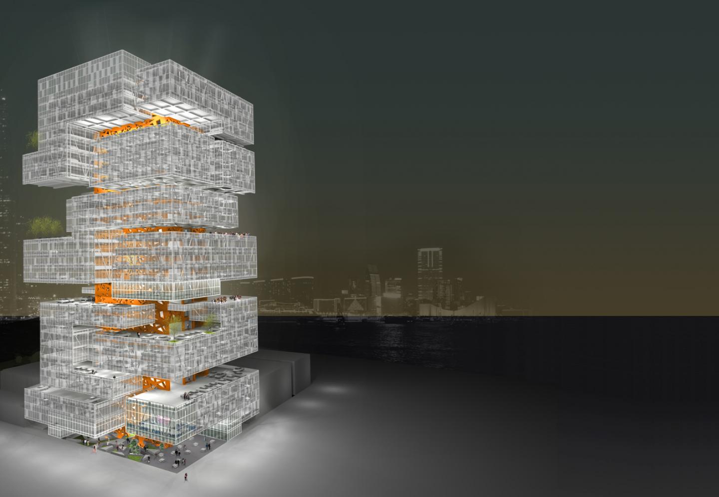 Inspired by the Chinese lantern plant, the Core(re)lation Park Tower seeks to redefine the way parking structures are design by creating a harmonious relation between its core and merging volumes which are articulated according to different functions such as parking, public spaces, cultural and entertainment areas; allowing multiple events to occur simultaneously. The volumes morph according to its program and relationship to the existing context. With the thought of creating a parking structure with a straightforward circulation system, the core of the tower acts as the reference point for the structures main circulation. Every aspect of the design such as vehicular circulation, fire staircase and elevators evolve from the core.