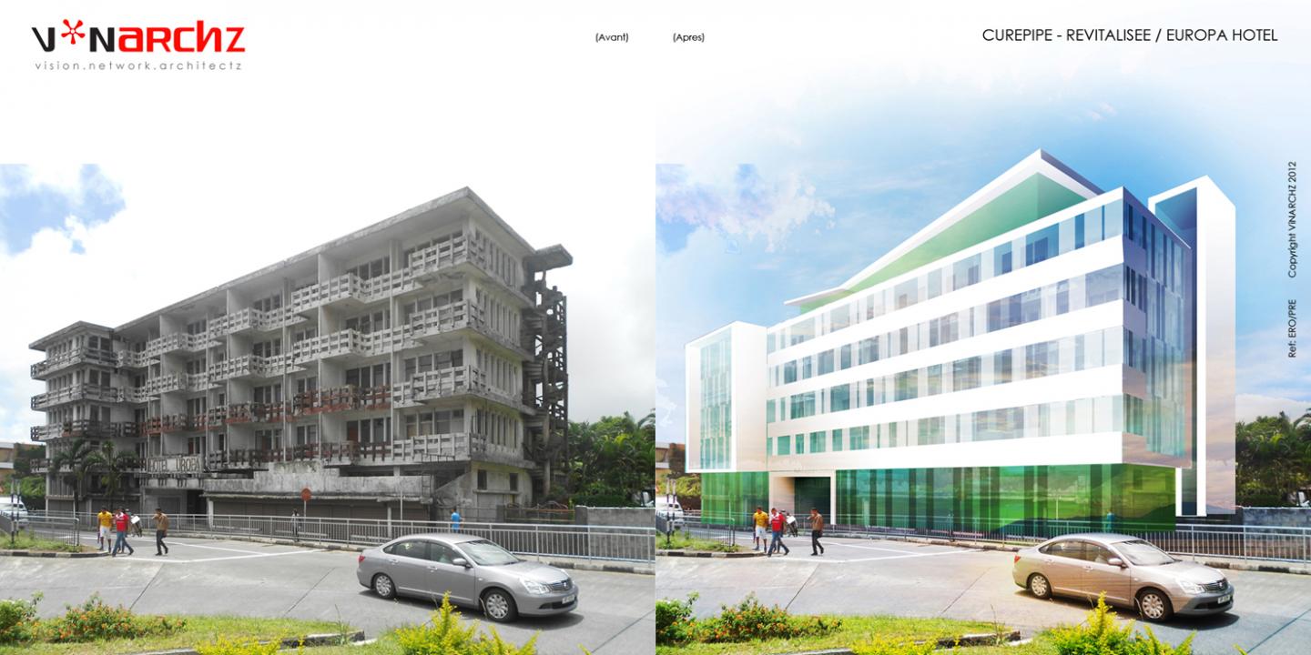 The new Europa is part of a prospective project scheme entitled: Curepipe Révitalisée - restructuration & rénovation urbaines. Several other buildings and sites are being revisited; relooked ! A public exibition on the same is in preparation and it aims at encourgaing debate on the future of the Ville Lumière which over the past decades, has the same grey tone / dreariness. Emphaisis is being laid on issues regarding living, working, leisure and transportation and it is intended that the local authorities and inhabitants debate/react in order to create a synergy to defining the future life style and built environment that suit Curepipe the best.