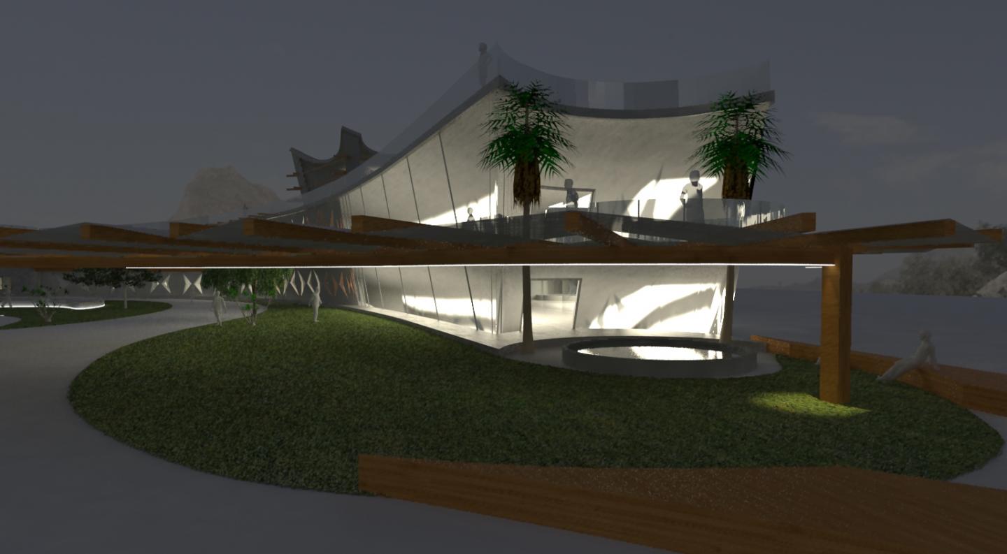The aim of this project focus on sustainable issue for cooling system inside the building by using of natural element such as wind and water and greenery courtyard further more consider of sun radiation which caused hitting and the form of the structure regarding to inclination of sun direction in order to protect interior of building from direct sun .