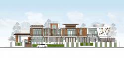 The living-house for a young family is located in the sub-division project of a small settlement in Songkhla province and is harmonious placed into the lush landscape. An unconventional building organization and placement of the house was developed further in an imaginative and thoughtful way advancing modern Thai house, energy and living concept. The client wished for a contemporary living experience that is blended into the existing landscape. The outcome and design solution is a surprising habitat at that reflects the way the family lives incorporating design quality, sustainability and functionality in every life. The U-shaped house is an innovative design approach that merged the needs of it’s residents with social and environmental contexts. The house, with 850 m2 of usable floor area, impresses with its generous view of “Do-dao space.” The deliberate and expressive building from establishes a dialogue with its surrounding landscape that providing a sense of tranquility and coolness. At the same time, the building achieved the very stringent local classification of a low-impact by using the passive design in the context of green architecture. Additionally, the building’s orientation and placement increased the comfort for the inhabitants.