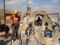 Attached to a variety of critical cracks in the castle under the first emergency measures A total of 48 cracks meter readings were achieved. The first study in July of 2011 visitors are expected to reach the first stage, focusing on the terrace area around the crack in a total of 32 gauge, wind speed and direction, humidity and temperature sensors, solar panel attached to places. Model 393B05 accelerometer in the field using the top level of the castle precise measurements, collected information about the dynamic properties of the tower. At the third visit in August of 2011, climbing team, working together with the previously inaccessible channels numbered between 33 and 48 with 16 dağcılarla additional sensor fitted. The first 32 are attached to the sensor calibration. Permanent accelerometers (2 each) were installed (AS-5GB). In the fourth visit (10-11 September 2011) which is necessary (2, 3, 4, 5, 6, 8, 9, 14, 16-23, 25, 26, 27, 29-31 N) sensors are reconditioned, 2, and 10 No. 50 No. 49 and the new sensors, the sensors changed. The alarm (sound + light) system were installed. Separated and transferred to the battery on the 12V supply channel dataloggerdan Mux1. The alarm program is written. Mux2 diff channel programming work was done, numbered input channels shifted SE2den de5. The first 32 locations of the channel was recorded with the video.