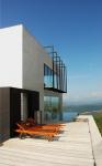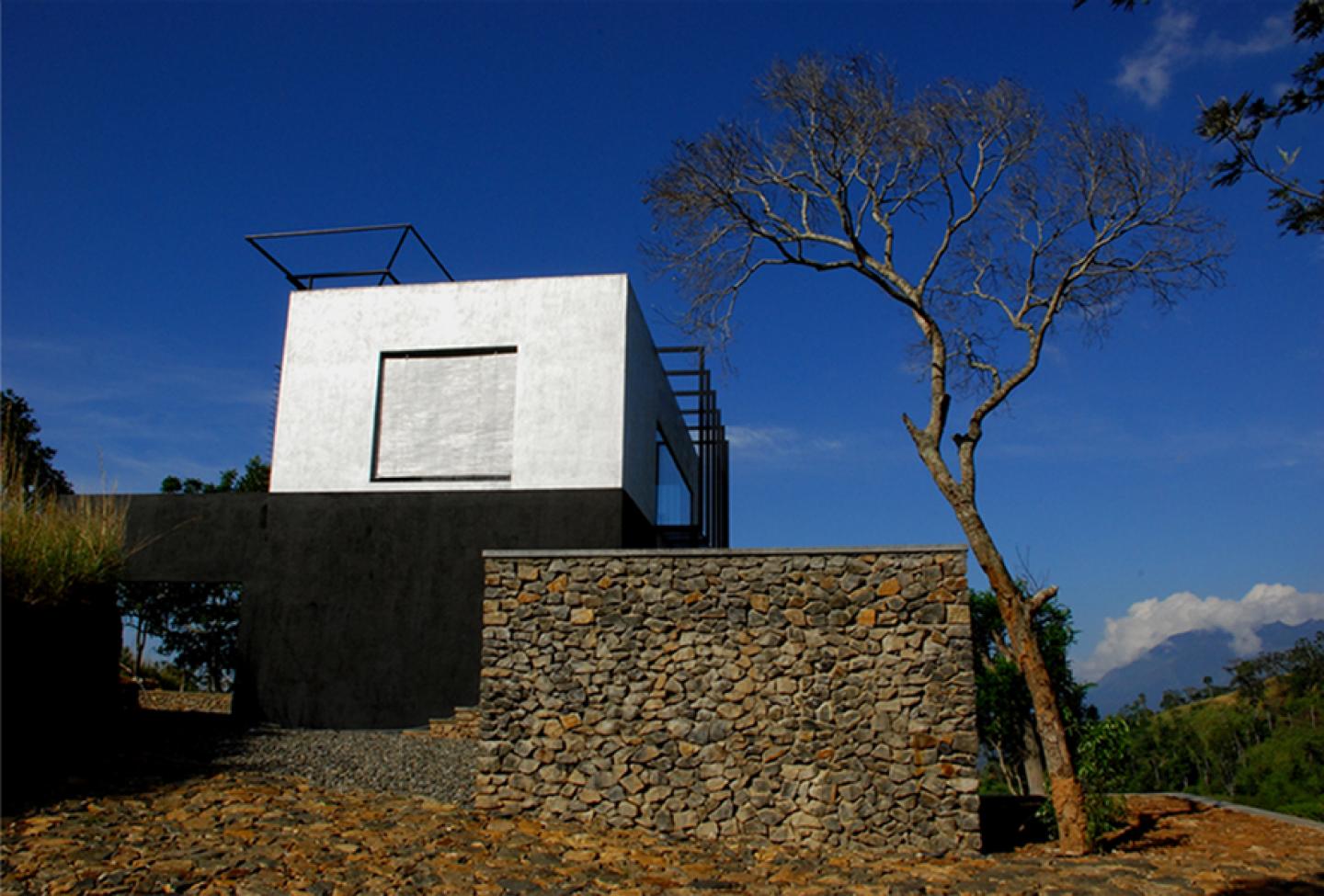 The dialog between the building and its setting is critical, if it is to appear harmonious. The house is a concrete and steel / glass box elevated on a mountain terrain. The surrounding nature is clearly different to the material used, which gives the benefit to the occupant to feel the difference while being in the comfort. The house is open from all sides, but covered with huge glass panels to capture every bit of the surrounding. Although it looks somewhat alienate to its immediate surroundings, the setting has made the difference to blend the building with the terrains