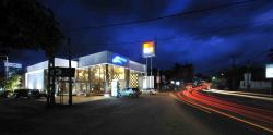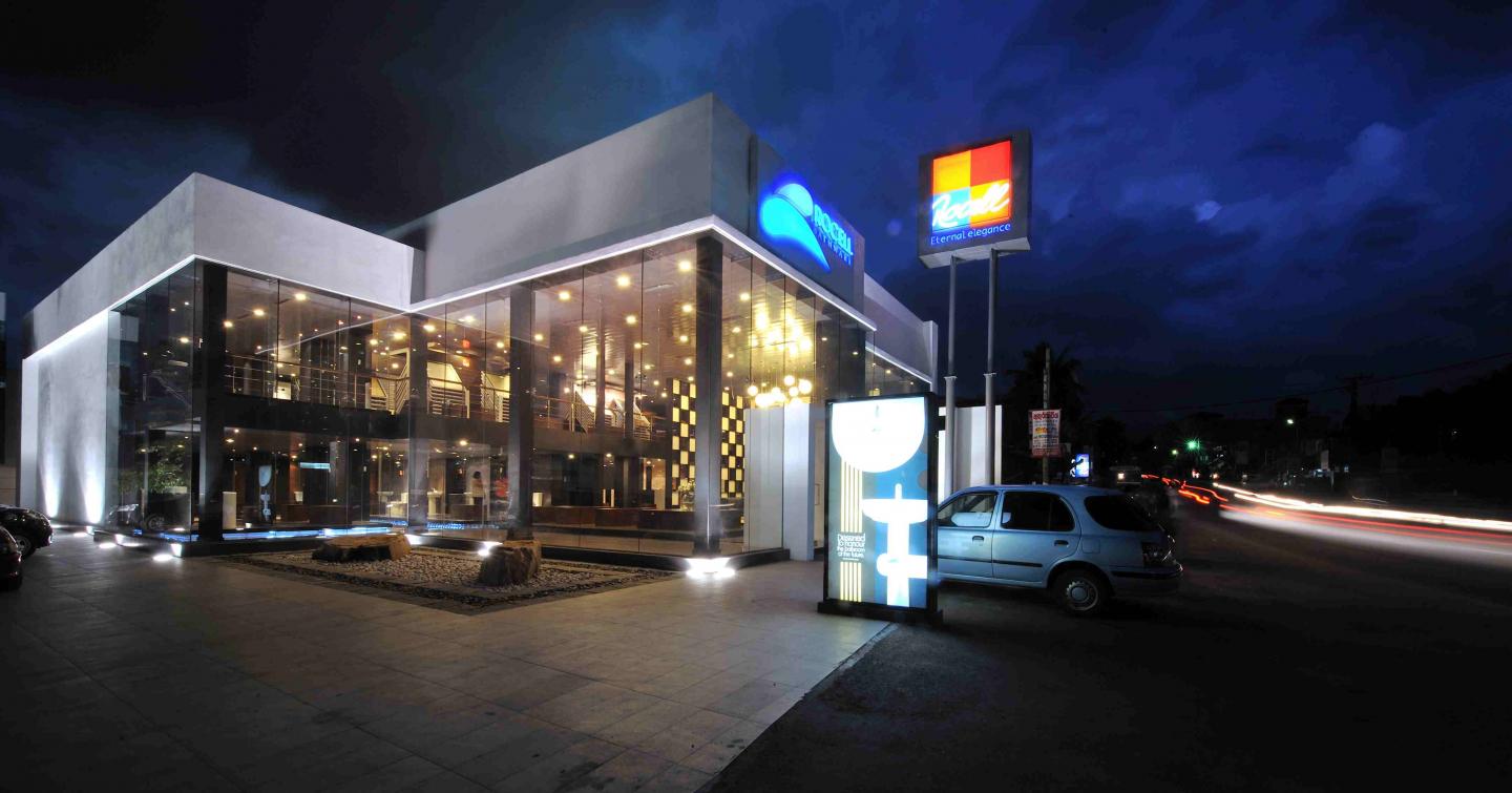An old disused car showroom and service centre was selected to be refurbished into a showroom concept centre for a new bathware range a leading tile manufacturing facility in Sri Lanka was planning to launch into the local market. Existing building was on a corner urban block adjoining a busy commercial street and a secondary smaller lane. However the existing old building only responded to the main commercial street while presenting a closed facade to the smaller lane. We as architects of the project took the decision to open up both the main road frontage with generous double height glazing realizing the true potential of this corner urban block abutting two streets. An additional cube was later added onto the existing building on the side lane side at the request of the clients to increase the display area of the Rocell concept centre showroom.