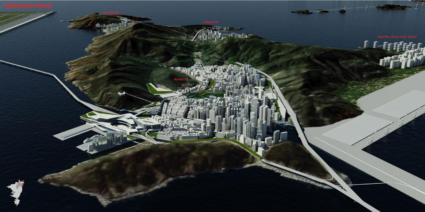 The island itself is naturally divided into four zones (Nulcha, Gadeok, Daehang, and the New Port Green Technology Sector) and is linked by a central node that controls access and facilitates sustainable activities. Consequently, the new Gadeokdo exhibits a self similarity, a microcosm, of the surrounding collection of cities with shared interest.