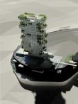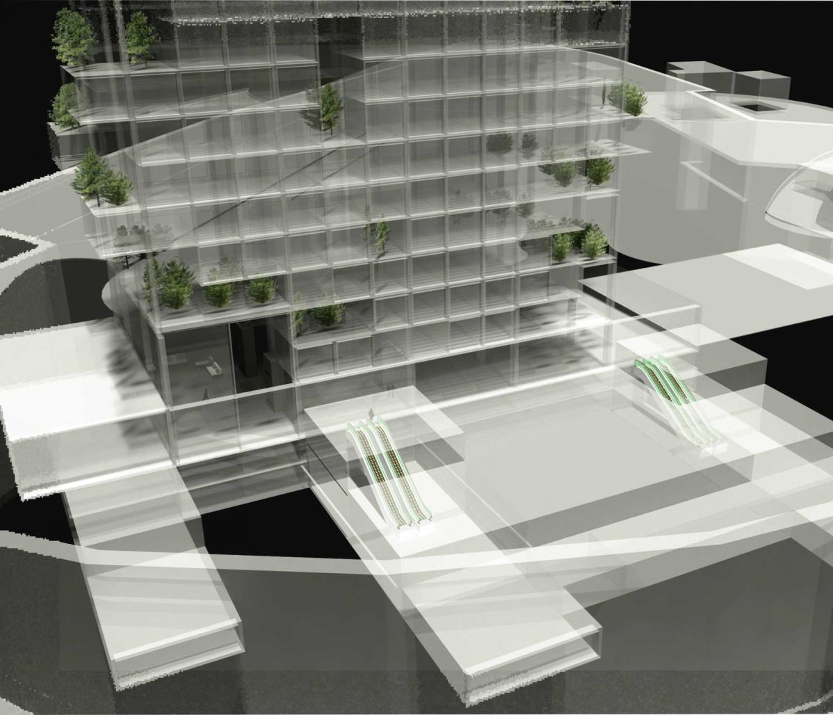 THIS PROPOSAL TAKES ADVANTAGE OF THE BASIC CHARACTERISTICS OFFERED BY THE PROJECT SITE. MOST IMPORTANTLY, IT IS LOCATED ON GROUND LEVEL 1096, ALLOWING THE HOTEL BUILDING TO DOMINATE ITS ENTIRE SURROUNDINGS ; THE INTERNATIONAL BUSINESS CENTER IS LOATED LESS THAN 6 METERS BELOW IT ON THE GROUND FLOOR. THE STRATEGY CONSISTS OF GIVING THE VISITOR A GRAND PLATFORM THAT PERMITS SPECTACULAR VIEWS OF THE CITY.