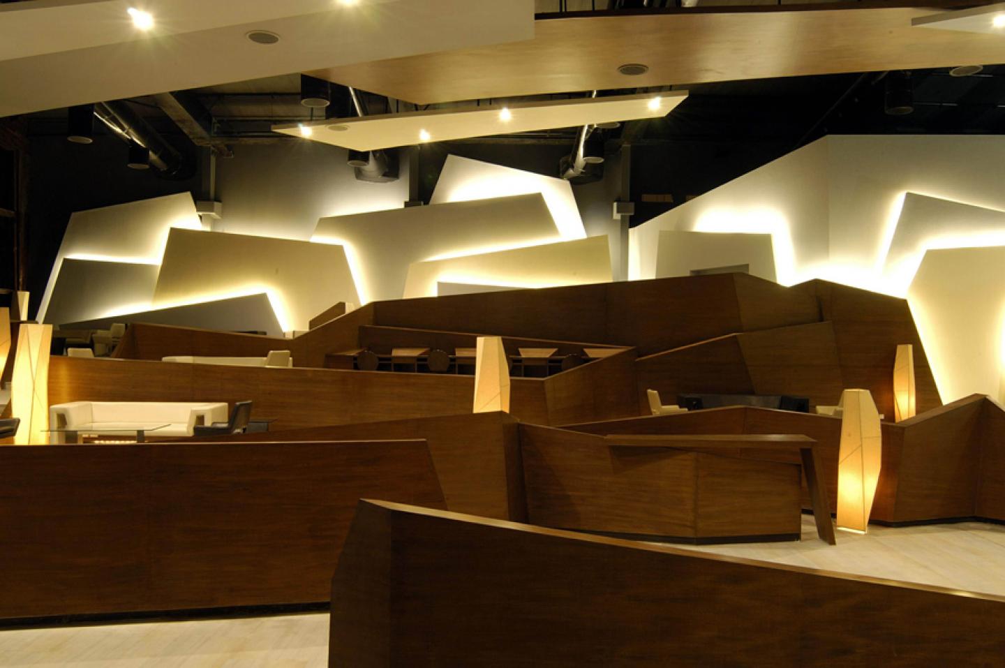 The ceiling roofs with AC ducts, structural system and electric cable rays painted in black, floating trapezoidal panels in wood and shades of white create a sculptural effect against this. The wood partitions allow privacy to the lounge areas and create spaces for display, a internet café and library within, whilst allowing the interior volume to be perceived in entirety. The rear wall is fragmented into a series of planes accentuated by reflected light that render it as a sculptural backdrop. Each level is bounded by wood partitions that change the direction in plan and vary in height and thickness simultaneously creating a rhythm and sculptural effect.