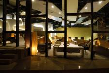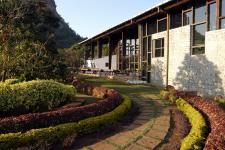 Floating panels in the ceiling that are linear and trapezoidal in shape and suspended at varying levels enhance the meandering movement of the low wood partitions. The only side of the internal volume with a high blank wall is rendered sculptural while creating a layered effect with trapezoidal planes of varying heights and depths that are enhanced by reflective lighting. The irregular-shaped linear platforms in white sandstone, with rising and falling wood partitions; linear trapezoidal floating ceiling panels and layered walls together create an abstract structural feel to the interior spaces. The layout with its abstraction allows uninterrupted views of the exterior landscape with gardens and hills. The interior thus capitalizes on the volume and the surroundings.