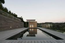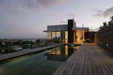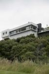 The design is a departure from the traditional placement of deck or outdoor area in front of the house instead the outdoor living is positioned partially behind the house to provide protection from the sea breezes, and capture the afternoon sun.