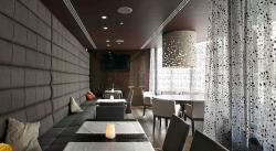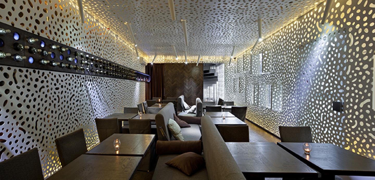 The indoor part of the complex preserves the atmosphere of the summer pavilion with a slight hint of intimacy. A clever play of light and shadows creates a feeling of sun rays piercing through the foliage. The perforated shell seems to be “hanging” in the air, revealing the scenery behind. The rest of the lighting is of theatrical nature, highlighting only the most important objects, sparing the intimacy of individual places. The furniture and lighting can be easily rearranged, allowing for fast transformations of the interior depending on the situation.
