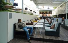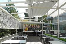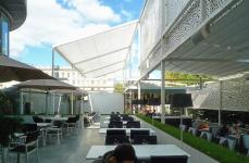 Historically, this place has always represented a gap in the urban tissue, which makes it even more valuable. Our aim was to retain this presence of emptiness, but at the same time provide it with a new content, preserving the existing building and trees. To this end we made use of the typology of “urban rooms” or “inner courtyards” to create a variety of miscellaneous, though interconnected spaces. The whole space is divided into three major “rooms”: the main room with a wooden terrace and a bar, with movable canopies above; a middle room with a summer kitchen and a fixed canopy, and a small “room” on the upper open-air terrace, which adjoins the cafe itself.