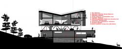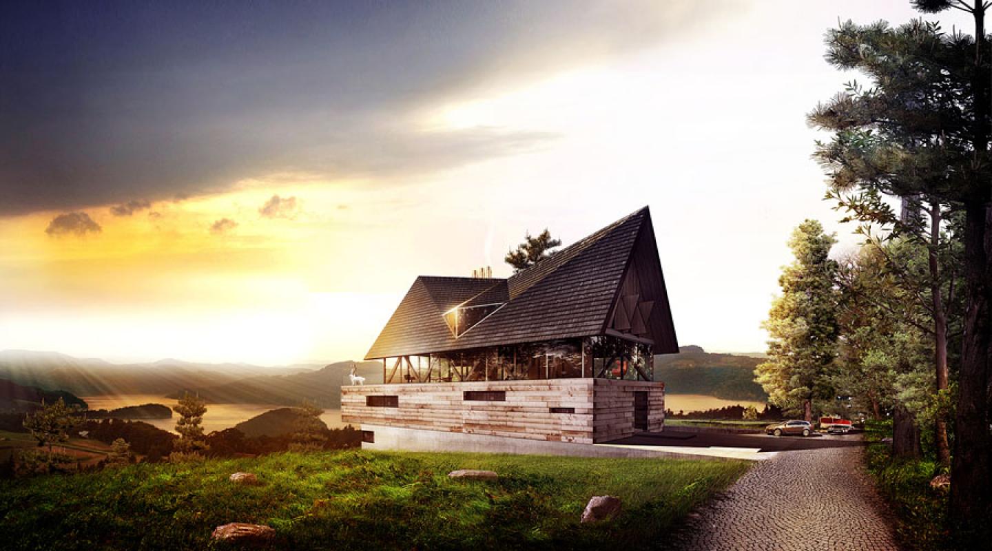 The architectural form of the house consist of concrete base, that supports the two wooden dominant elements diverted by transparent modern glassed floor. Static heavy rectangular wooden block refers to the traditional wooden houses when the dynamic and lightweight form topping the house is inspired by the forms of wooden churches. Two separate architectural forms create spatial dialogue of intriguing contrasts.