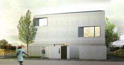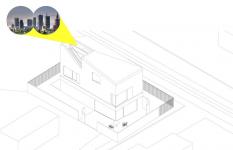 The building is situated on a small corner plot in the near suburbs of Warsaw. The surrounding is comprised of single family housesn, ot higher than 2 storey, as well as some unused plots. The main design task was to achieve a high degree of privacy for the garden and rooms in the ground floor while being situated quite near to the plot perimeter and the neighbouring roads. Therefore, the garden has been divided into a series of patios (synchronised with the transparency of the fence), functionally linked to the rooms on the ground floor. In addition, the top of the building includes a terrace resembling of a crows nest, whicch offers a generous view of the Warsaw skyline over the neighbouring roofs. At the same time, the terrace can be considered as the most private part of the garden, as it protects from the neighbors and pedestrians sight.