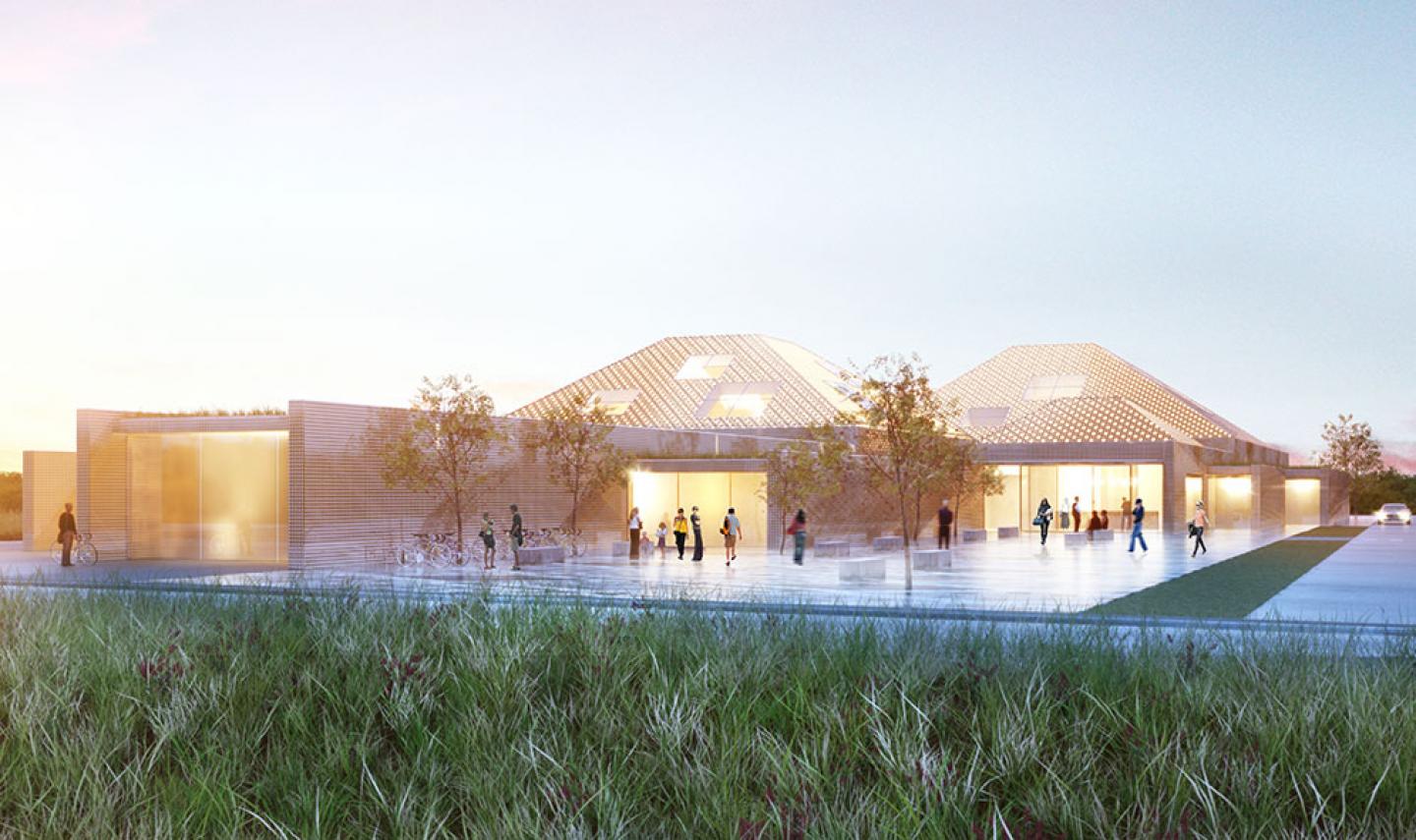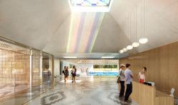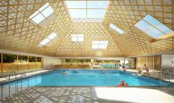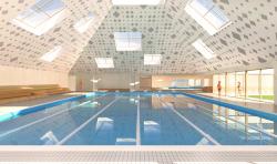 The building was designed like a succession of longitudinal volumes that unfold in depth to create a large hardscaped and planted entrance forecourt along the main road. The overrall form of the water leisure centre is like a success ion of long walls oriented North-South containing the functional elements that form an acoustic screen for the swimming pools hall positioned on the south. The two swimming pool halls are placed diagonally to create a depth of field and a spatial sequence while creating two atmospheres and two specific worlds. The pool areas are a series of pyramidal volumes lined with a meshed wood grid and a patterned stretched fabric with overhead openings arranged apparently at random around the roof.