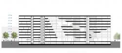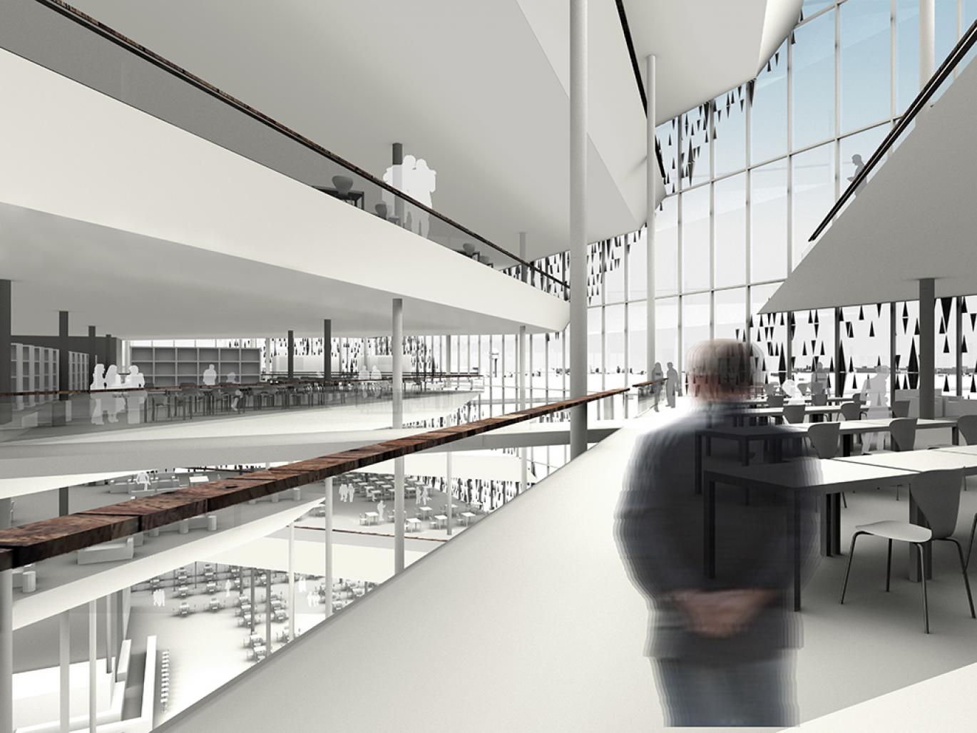 The appearance of the building is defined by the internal organisation. Various cuts into the building volume organise the functional and spatial relations. Through this cut, the library areas are transformed in the multi-layer spatial organisation and provide a unique atmosphere to the library. The cuts create a continuity of voids providing a continuos public space within the central library.