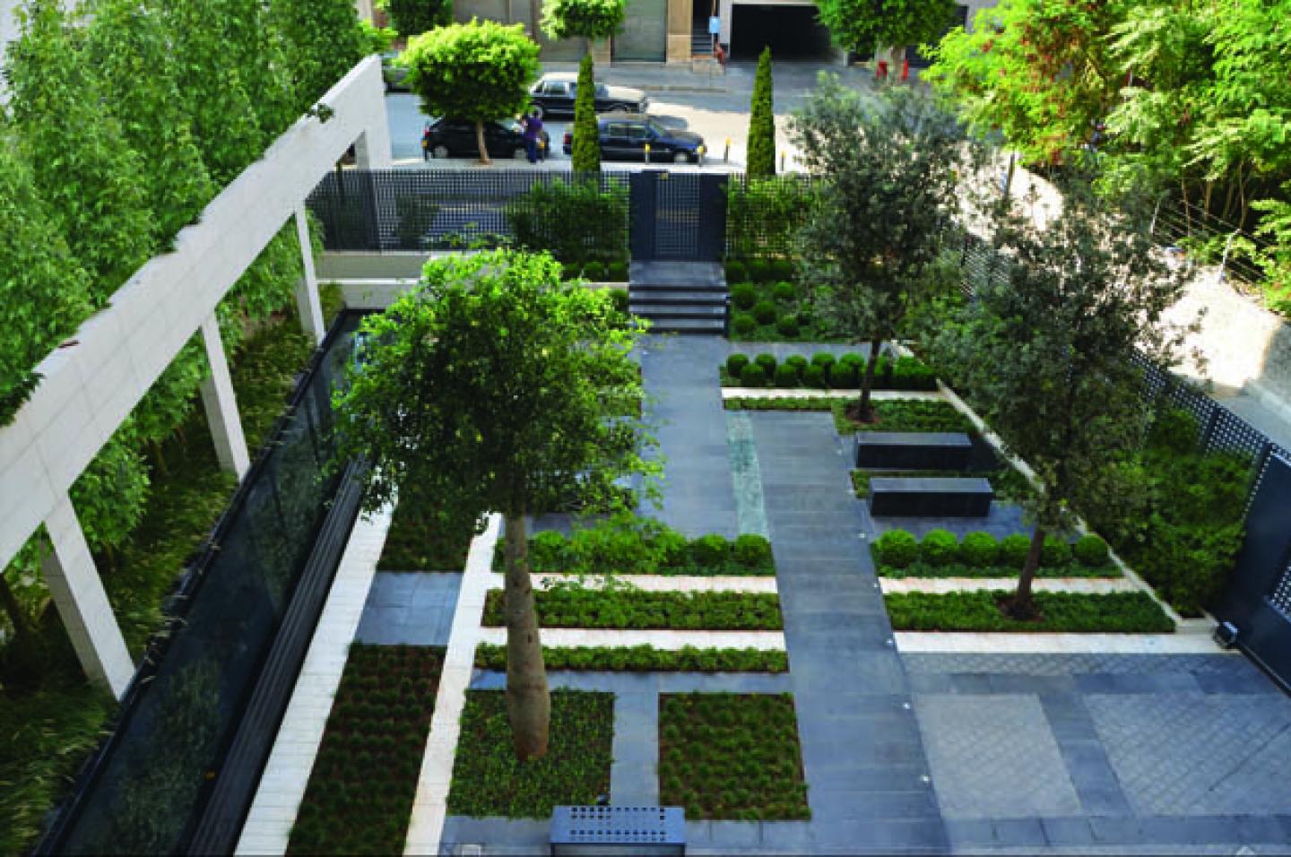Moreover, several technical issues arose. The problem-solving approach had to deal with a shallow soil layer, due to the fact that the garden had to be built above the building’s parking. Additionally, one side of the garden had to accommodate for car access as well as pedestrian access, to allow for handicap and senior visitors’ easy and safe access to the building’s entrance as well as the garden itself.