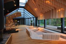 The interior is inseparably connected to the architecture. These are incorporated spatial shells, which all have a function of their own: a sitting pool, fireplace, stairway and the dining room. The spatial shells are a generic element, which give, with repetition of functionally different units, a rich sensual experience.