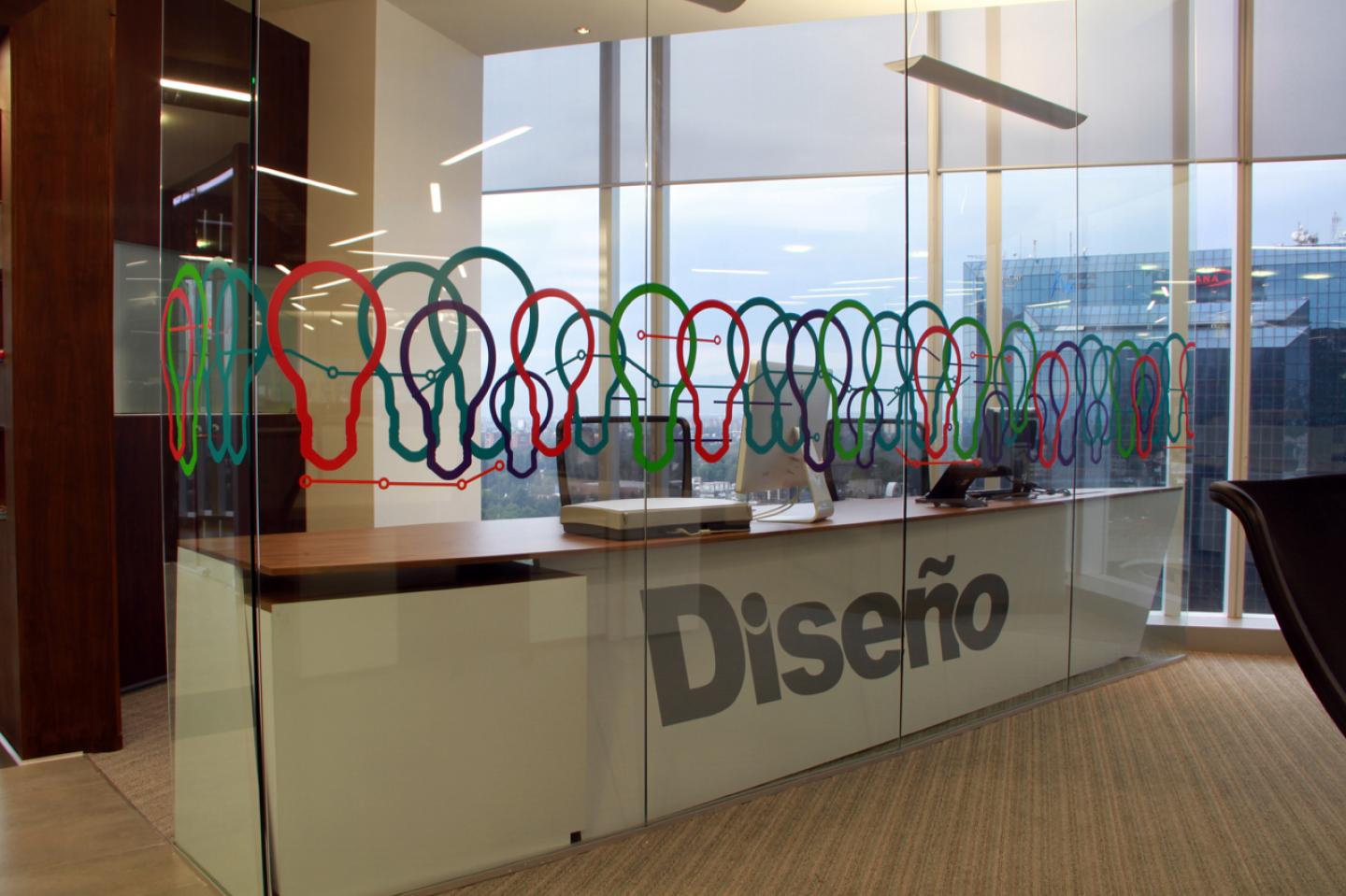 In the glass partitions and some walls, monochrome and full color graphics, were applied to meet the safety regulations and also emphasize the dynamic environment of the company. The closed offices partitions were also done in glass to fully exploit the natural light coming through the surrounding windows. When going into the offices it stands out the wallpaper with Javier Mariscal´s designs.