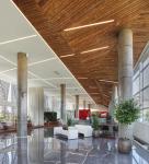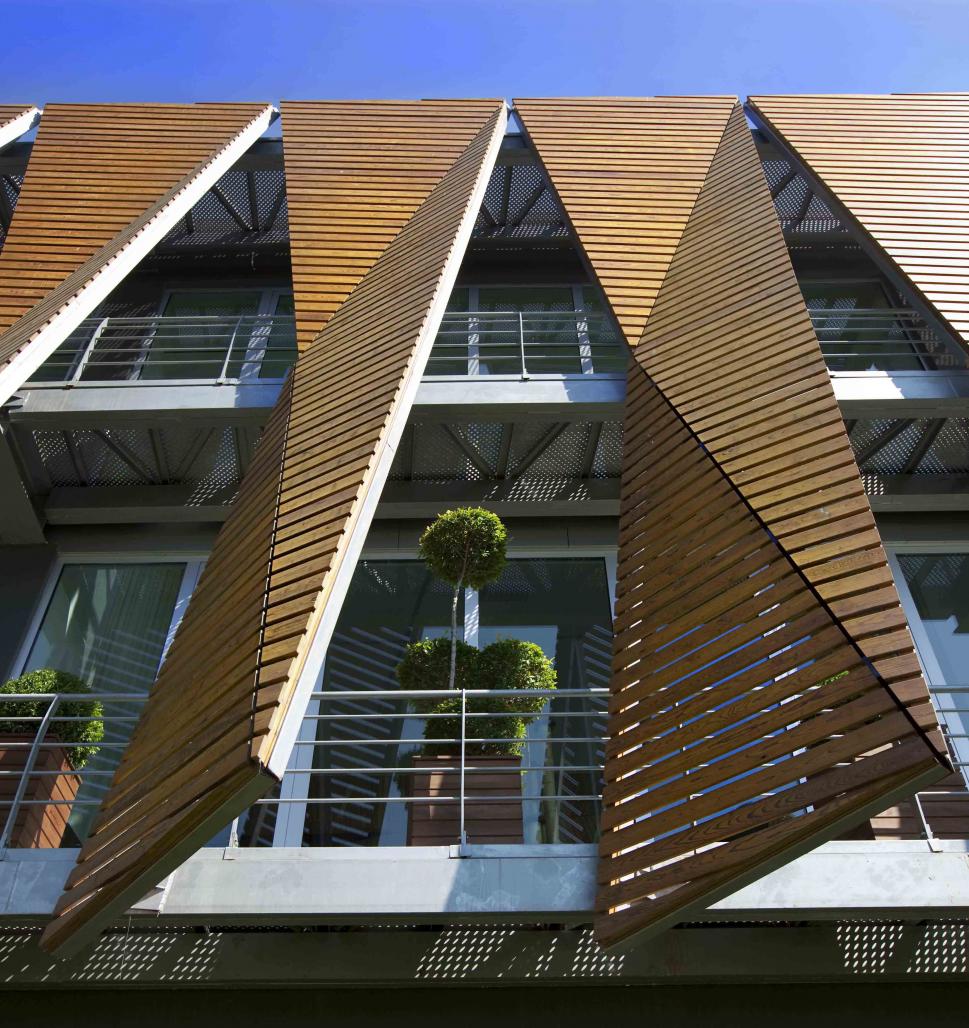 South facade is placed in front of a glass surface as a seconday façade. Geometric wooden panels strengthen the perception of the building from the main road and the solid-void relationship brings a comfortable office ambiance by the control of sunlight and sound. The space which is in between with wooden panels and glass façade, turns into terraces that provide natural air condition. North facade,which is a side facing to residential complex, is designed more transparent in order to see the construction site easiliy for visitors.