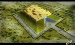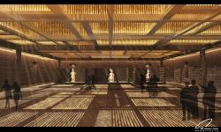 Each of the cuboids that form the roof of the temple is created in bamboo screens above a concrete rectilinear grid with natural ventilation and natural light entering through the spaces formed by the height variation of the cuboids.