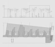 The pavement expresses explicitly, the vocation of the space to connect with existing pedestrian path. Thus, using the same type of tile that sidewalk, it is proposed a certain kind of contamination, by combining hexagonal tiles hydraulic block 10 cm diameter, gray concrete, with the pavement of the new space, by concrete block hexagonal yellow, 30 cm diameter. The gasket between the two materials is cor-ten steel plate, which are used on the formation of the tree wells.