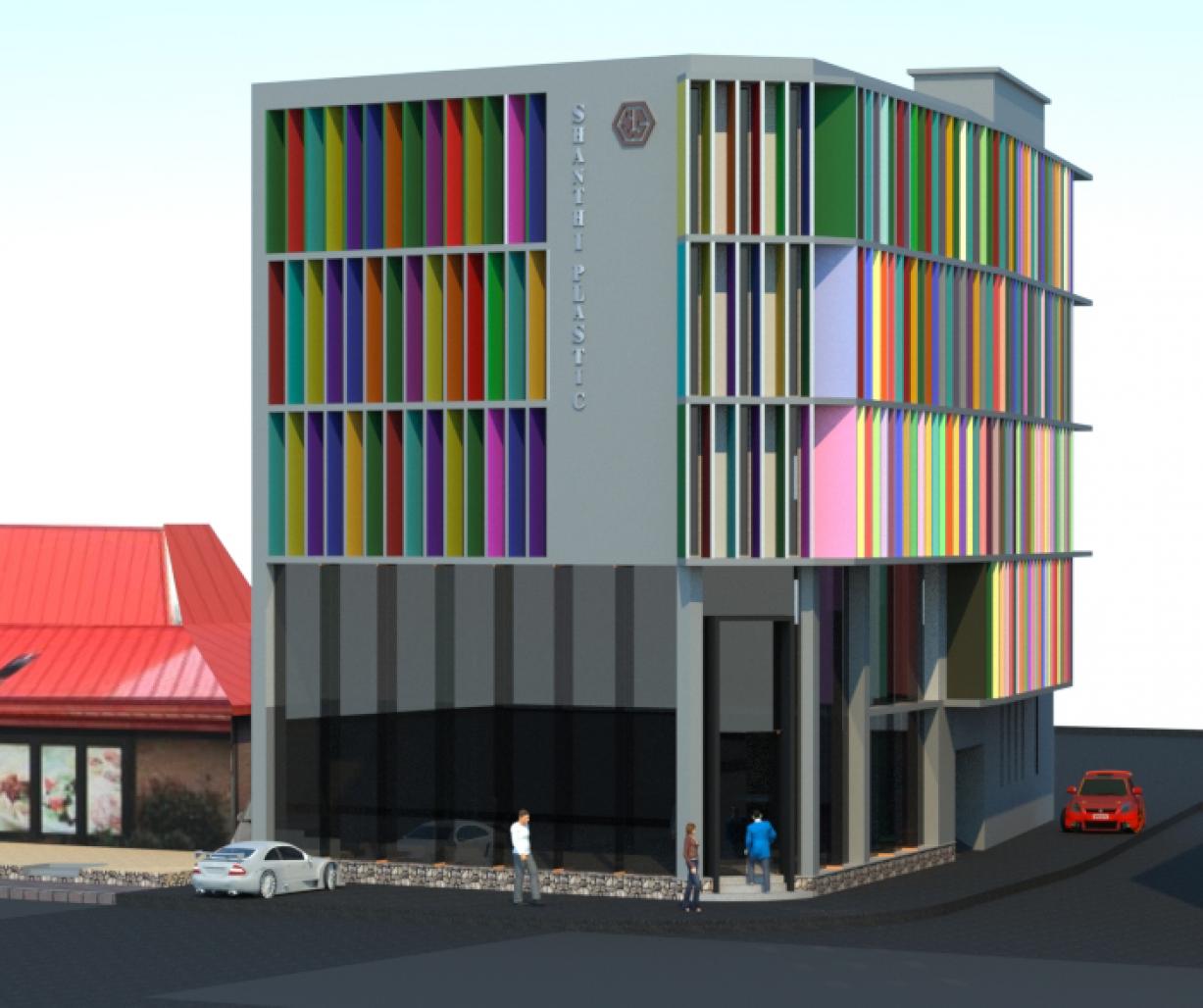 The building was designed as the flagship concept store for the leading plastic importer in Sri Lanka.In line with the coloured plastics the company is famous for importing to Sri Lanka, the building was given a colourfull facade similar to a giant colour card by the introduction of numerous lip walls on either side of series of narrow linear aluminium framed glazed windows, painted different colours. Ground and First Floors were completely glazed using double height tempered glass, so that at night the interior of the concept store will glow like a lantern. The Building is located on a corner block, bounded by a main arterial road and a side road of Colombo Suburb Nugegoda. as a response to the corner block situation the double height entrance was positioned in the corner between both roads.