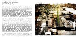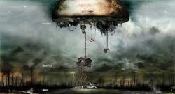 The ground itself being part of a derelict area supports the idea of decay. The removed part is floating in the air on the beginning of its journey to the sky.