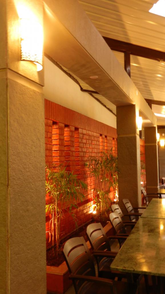 It is an outdoor Restaurant/ Fast Food Center in Nashik City, Maharashtra, India. It was an outdoor open space of a Hotel with lots of shrubs & Plantation. Our intetion of Planning was not to disturb the existing locations of Trees & Plants i.e. Blending the structure with nature. The whole structure is in M.S. Fabrication enchased by RCC on which layer of Natural Stones are laid. Roof is cover with double layer of Galv- Aluminium Sheets to reduce heat transfer. Double layer of Polycarbonate Sheets are provided to increase natural light. The slope of the roof is so adjusted that the rain water naturally falls into the Plantation Area. The ambience of Artifial Lighting is given in such a way to enchance the nature & natural stones.