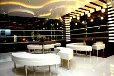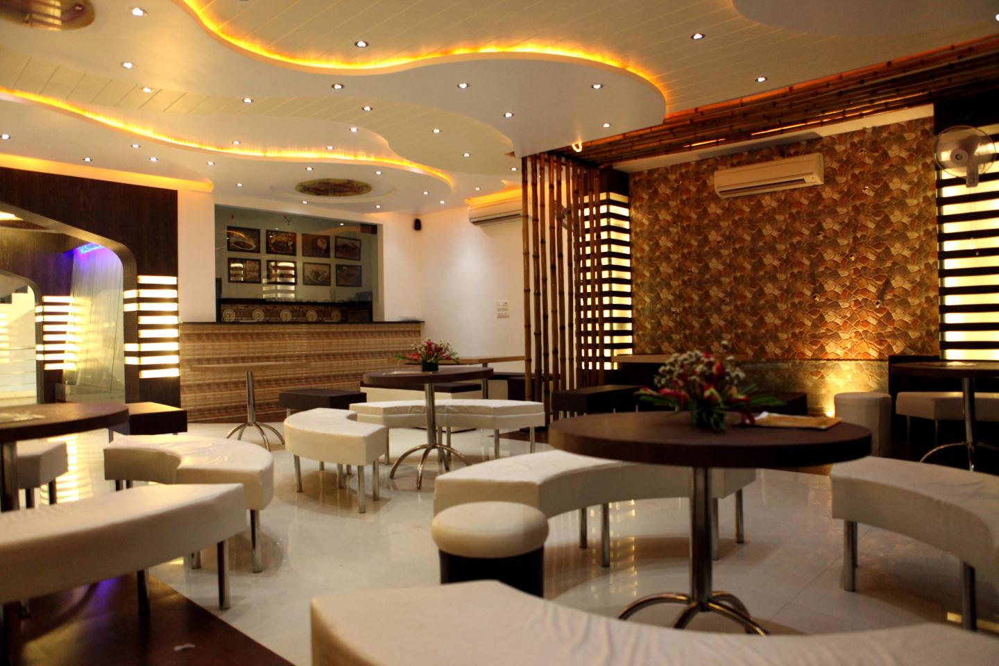 A very High luking Restaurant with iits sitting on road side to get the attachement of road is to be done with all contemporary elements of design using light effects
