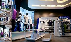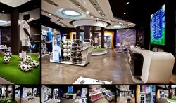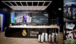The design concept of the store is based on an experience at the Santiago Bernabeu, all the walls are lined with images that make you teleport to the center of the field, in game action. LEDs are integrated in the images of the walls to create the effects of the public taking pictures with flash. These LEDs are synchronized with the in-store multimedia system, and activated when a goal happens in the media wall screens, all these while listening to the crowded stadium. The players reflected on the walls of the store are legends that have been indispensable for the greatness and immortality in the club.
