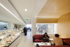 In our research we´ve found studies that prove that the presence of color and forms that are food alike actually makes people hungrier. So to get that input on the users, we´ve picked the twenty most wanted products of the bakery and based on a pattern of global identification we found a middle tone and applied it on the walls.