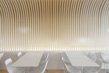 So, to solve these problems we knew we had to break the sound waves and refract the light. And so we did, by creating a second ceiling that results from the repetition of wooden stripes, we found a system that could solve the two problems in a row.