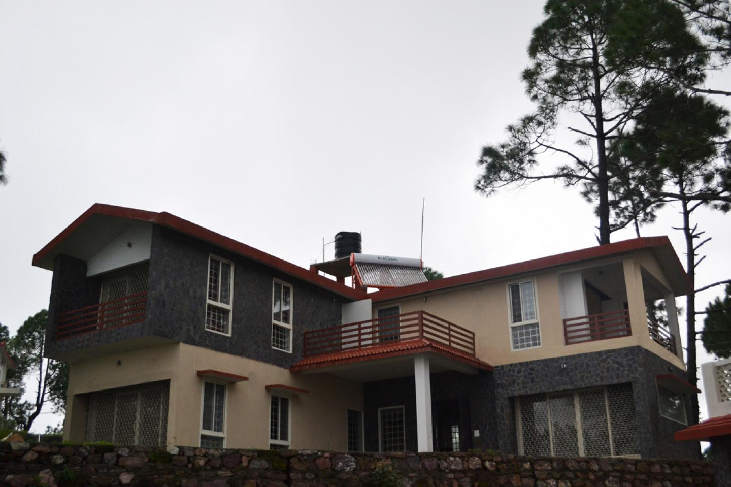 Abundant natural light filters through the house through huge windows through which the sun set and the dawn of neighbouring Nainital and the lakes can be enjoyed. The windows also allow for views of the valley from all parts of the house, and open-air living. A Natural wood fireplace, built from locally available material is created in the living area to enjoy the wintery nights, looking out into the valley. Locally available materials are used to build ecologically. The locally available stone renders the home with an earthly quality and aids in the merging of the built form with the landscape. Solar water heating is provided to maximize the direct sunlight.