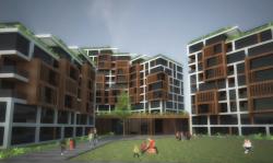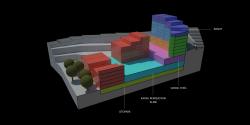 Social areas opening up to the landscaped area in front were planned underneath the upper platform. Internal pools, gyms, wellness center, etc. were planned on the basement of the lower platform. Technical spaces and garage are solved on the lowest basement floor. Parking space covers the whole construction area, so that direct access can be provided from the garage to each residential block.