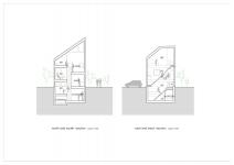 The footprint of the house including a biscuit shop is only 26㎡. This entire interior is divided into seven sprit levels void of partitions and linked by a staircase in the middle. From the shop on the ground floor, a metal staircase links to the kitchen and dining, then living and finally a sleeping space at the top shared by all the family members. A second set of concrete steps continue from the ground floor to the basement, housing the bathroom and store.