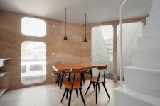 The footprint of the house including a biscuit shop is only 26㎡. This entire interior is divided into seven sprit levels void of partitions and linked by a staircase in the middle. From the shop on the ground floor, a metal staircase links to the kitchen and dining, then living and finally a sleeping space at the top shared by all the family members. A second set of concrete steps continue from the ground floor to the basement, housing the bathroom and store.