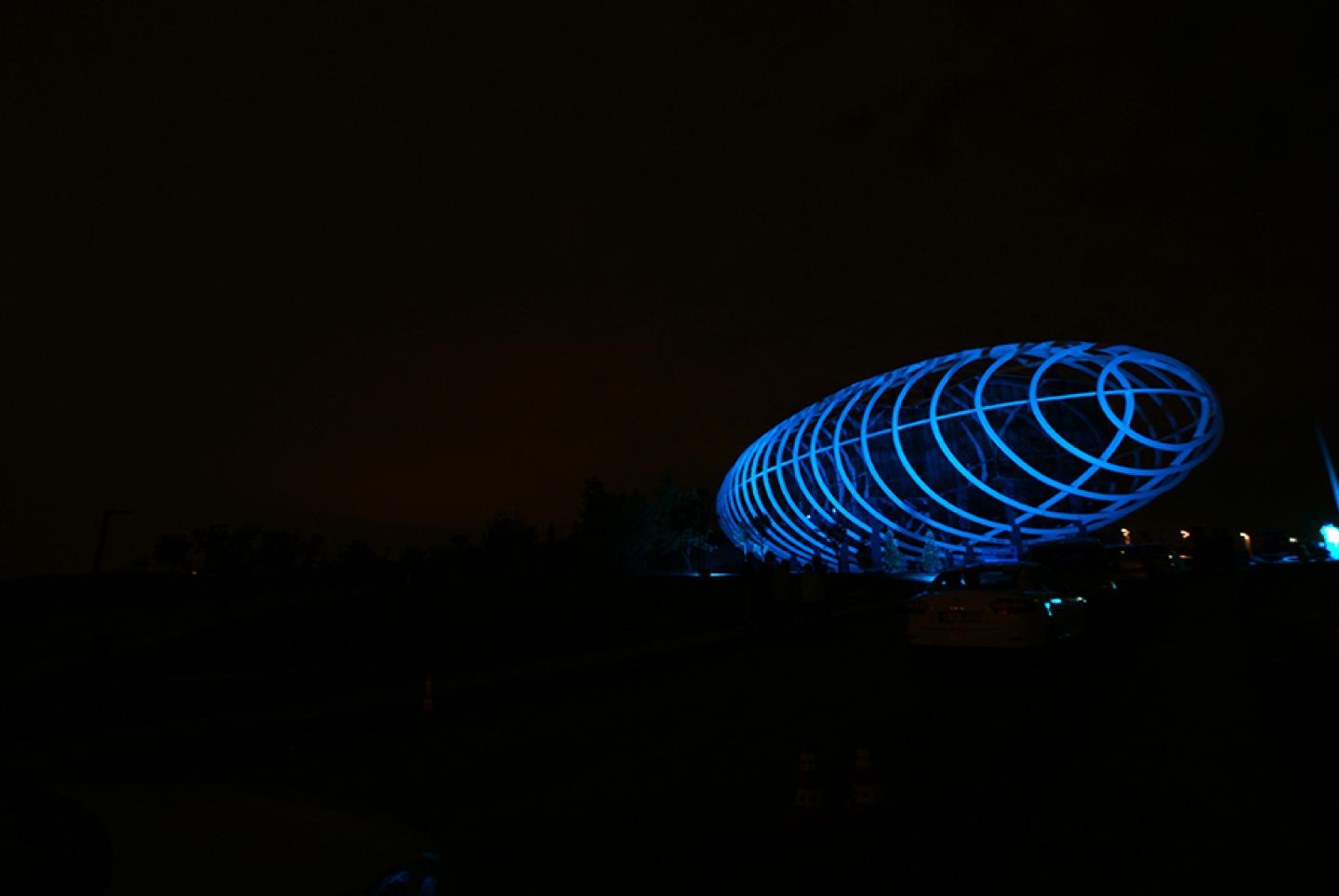 Facing the Istanbul TEM (Trans European Motorway) where thousands of vehicles pass throughout the day, the building sits on a sloped green landscape while stretching towards the highway. The functional portion of the building is covered with a reflective glass curtain wall. The structure sits on a black pool that reflects the under portion of the building, creating an elevated effect. The white elliptical steel ribs surround the building; unify the building as a whole. Based on the time of day, this envelope generates different visual interactions in relation with its context, thus drawing attention to itself. During the day, the functional portion of the building seems almost invisible due to the mirrored façade reflecting the surroundings, leaving the white ribs to appear as if they were floating in space. While at night, when the steel ribs are lit with LEDs, the building transforms into sculpture of light; an autonomous shining object in the dark, slowly changing in color.