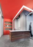 The AIA NE office space maximizes AIA NE’s engagement with its members and the larger public by creating an interface that is both physical and visual. A ‘Folded Red Plane’ element connects and serves as a common thread for three primary spaces (backdrop and separation for the Executive Assistant’s workspace, the informal conference area, and the Executive Director’s Office). It also creates a highly visible signature feature with its “AIA Red” color and supergraphic logo that reinforces AIA NE’s brand identity.