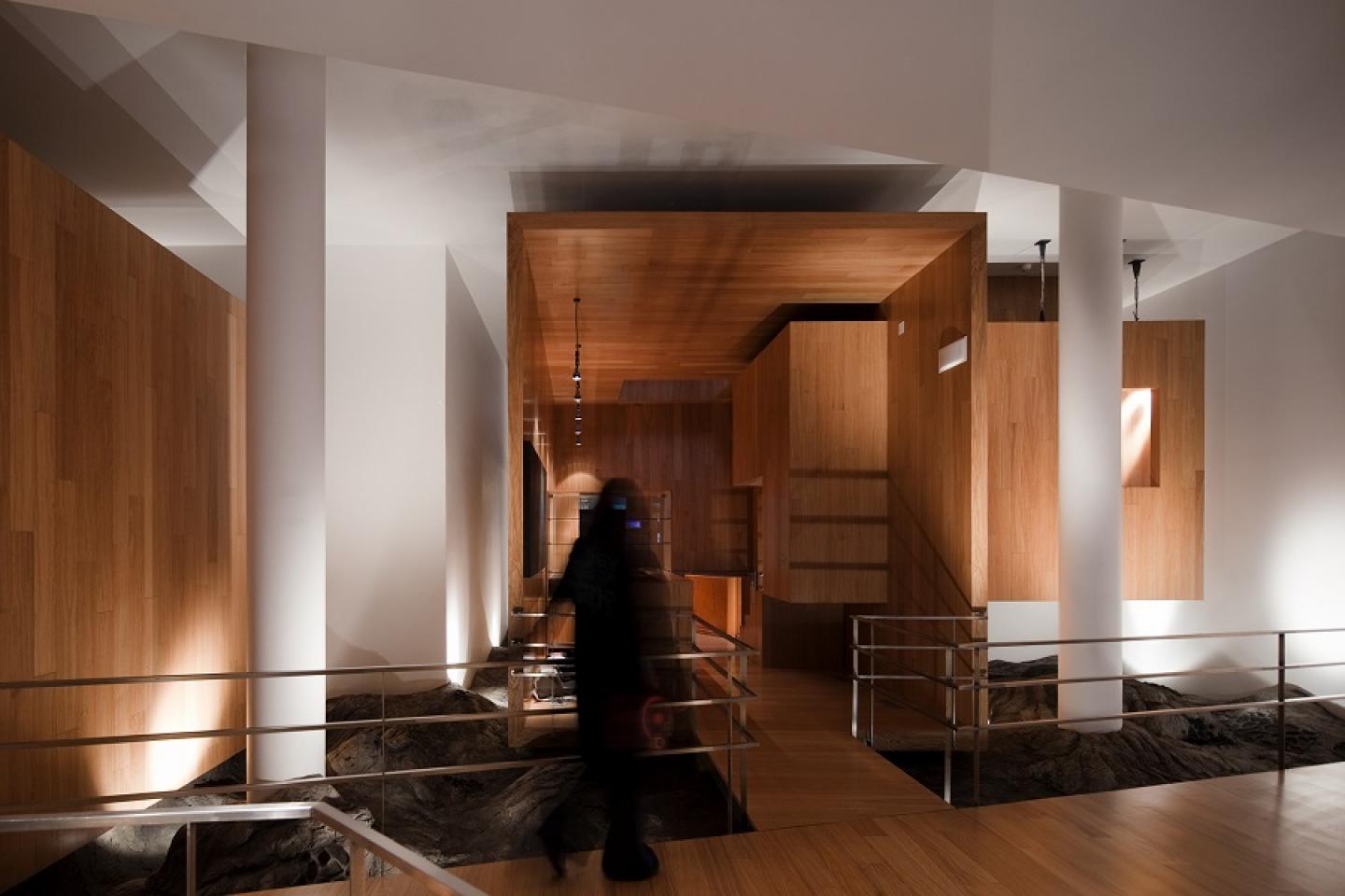 Built underground and surrounded by a thick natural stone wall, the project converted the tanks into exhibition rooms, keeping their original concrete structure, and expanded the intervention area by digging the surrounding soil, creating a spacious place in which light wooden volumes can be seen floating, clearly differentiating the new constructions from the old. All these combination of materials - the concrete oil tanks, the light wooden spaces and the natural stone wall – were designed to create a unifying space that appeals for the senses.