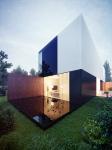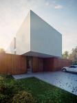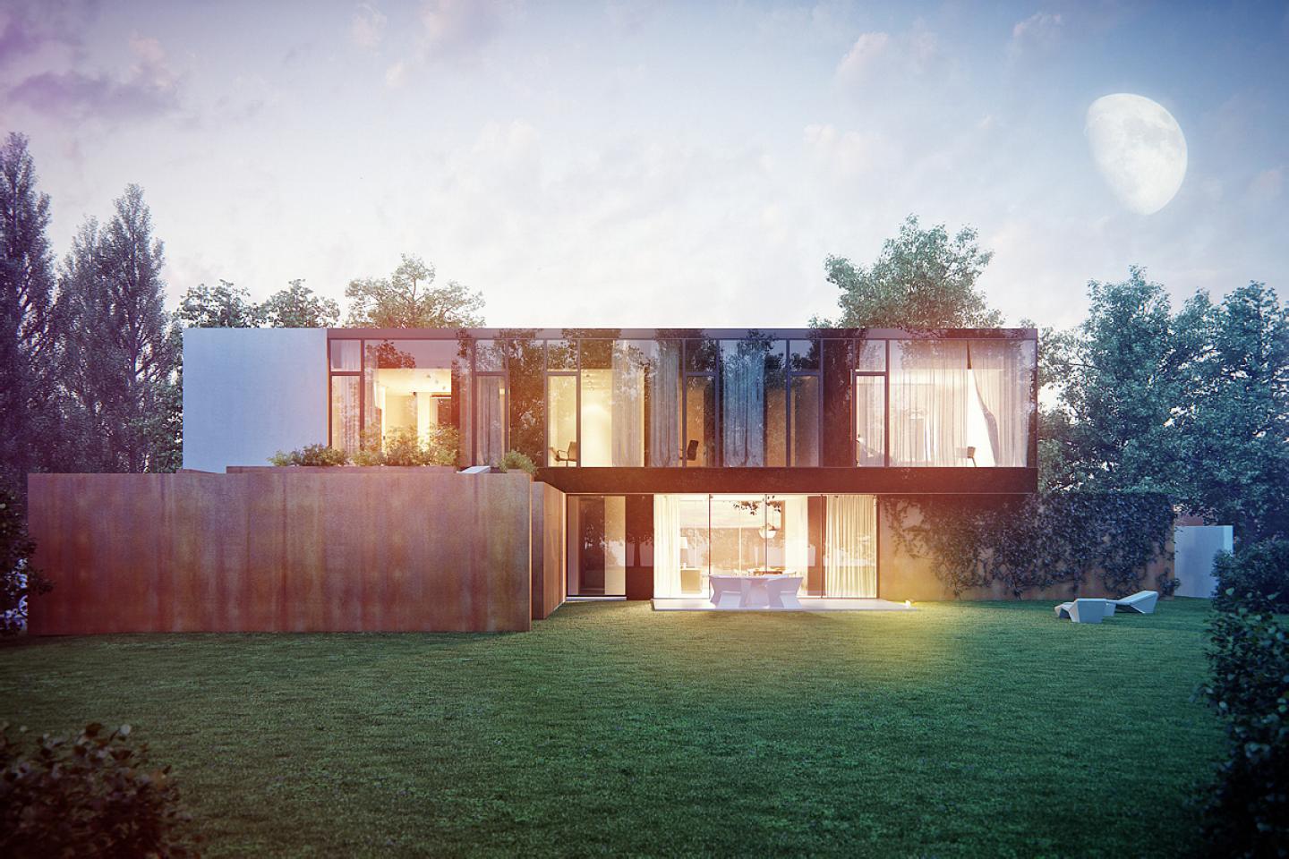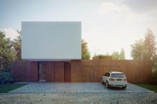 Architects’ own house is made of contrasts. White cubic solids and a strip of dark Corten metal sheet are juxtaposed and can be seen from the street. Huge glazing form garden elevation which blurs the frontier between the exterior and the interior. Private and public spheres are clearly divided. The study and the studio are connected and become an independent part in the front of the house. On the other hand, the living room and the day room with the kitchenette are located in the back of the house. Sliding windows allow to combine the living room with the garden. Panoramic windows on the first floor ensure maximum sunlight in the bedroom and guestrooms. Bright interiors are hidden behind monolithic, windowless facade. Rust, snow-white walls and cool glass sheets are a perfect, minimalistic frame for a picturesque greenery