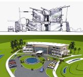 | Features: Curved building with large view windows to maximize views to the cement plant as well as the picturesque surroundings of the salt range / Light shelves and strategically placed skylights for maximizing day light / Sloped Roof towards south following the sun for installation of solar panels / Most building materials sourced within 300 km of the site.